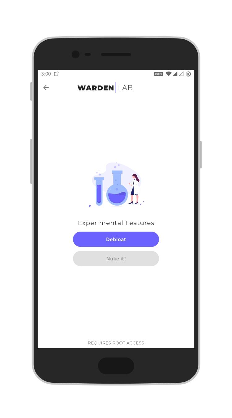 Этот экспериментальный инструмент использует пользовательские профили, предварительно созданные в указанном формате, для освобождения вашего гаджета от ненужного предустановленного софта. Пользовательские профили должны храниться в «ExternalStorage/Warden/Profiles». Действие по умолчанию установлено на «отключить», но вы можете вручную установить его на «удалить» или «скрыть». - Nuke it!
