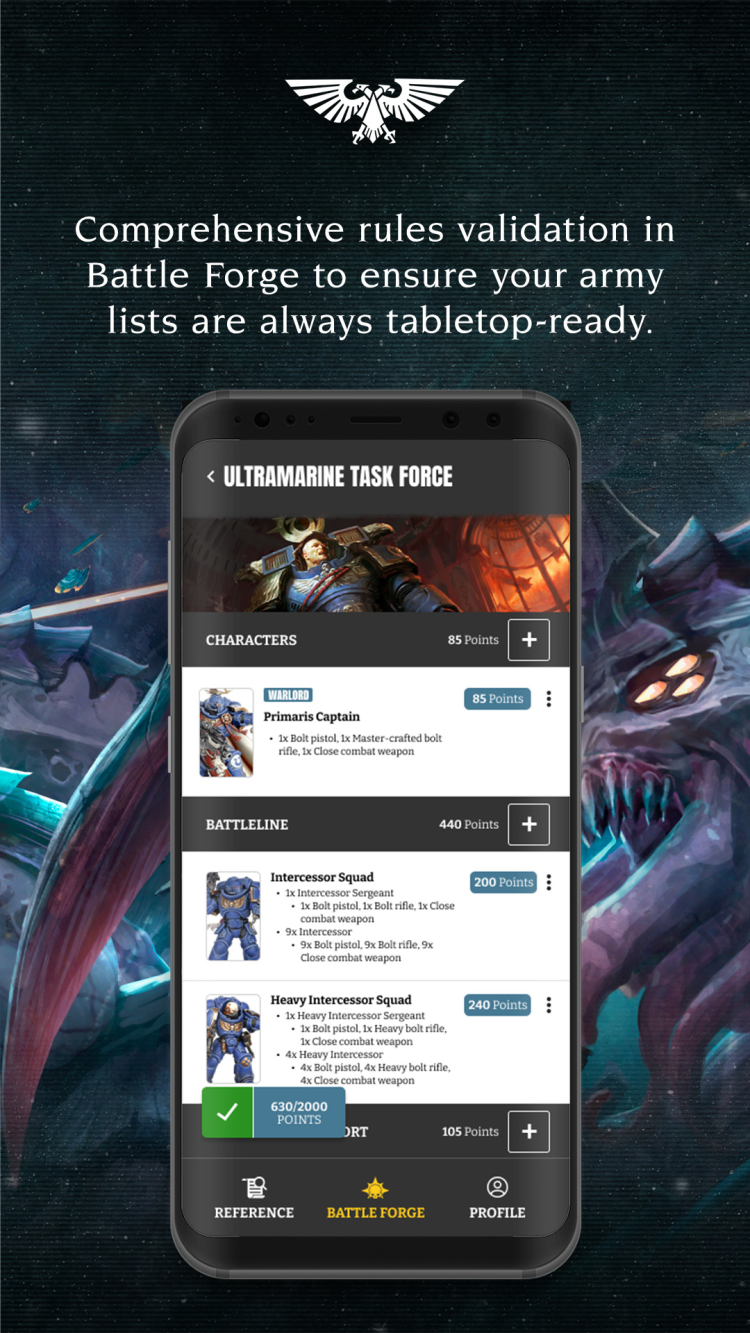 Еще одна важная функция приложения — сохранение листов данных для вашей армии в удобном для чтения виде. Управляйте войсками с экрана вашего смартфона, в пару нажатий. Стоит отметить, что приложение может помочь создать армию на основе вашей коллекции в Battle Forge. Наберите непобедимую армию и станьте мастером-стратегом с Warhammer 40,000: The App APK.
