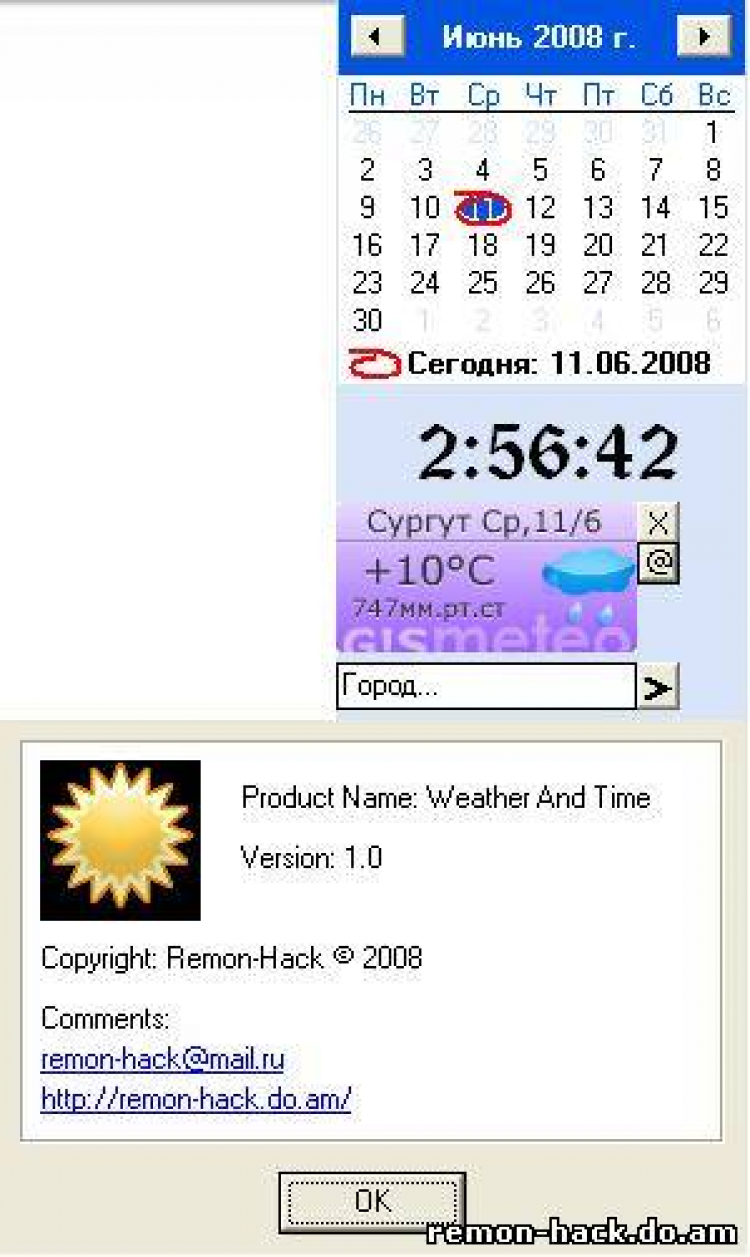 WAT - это программа, которая представляет собой простенькую оболочку с календарём, отображает текущее время и погоду. Погода берётся с сайта gismeteo, так, что необходимо подключение к интернету, для получения данных о погоде. Полезный наборчик для офиса или домашнего компьютера.