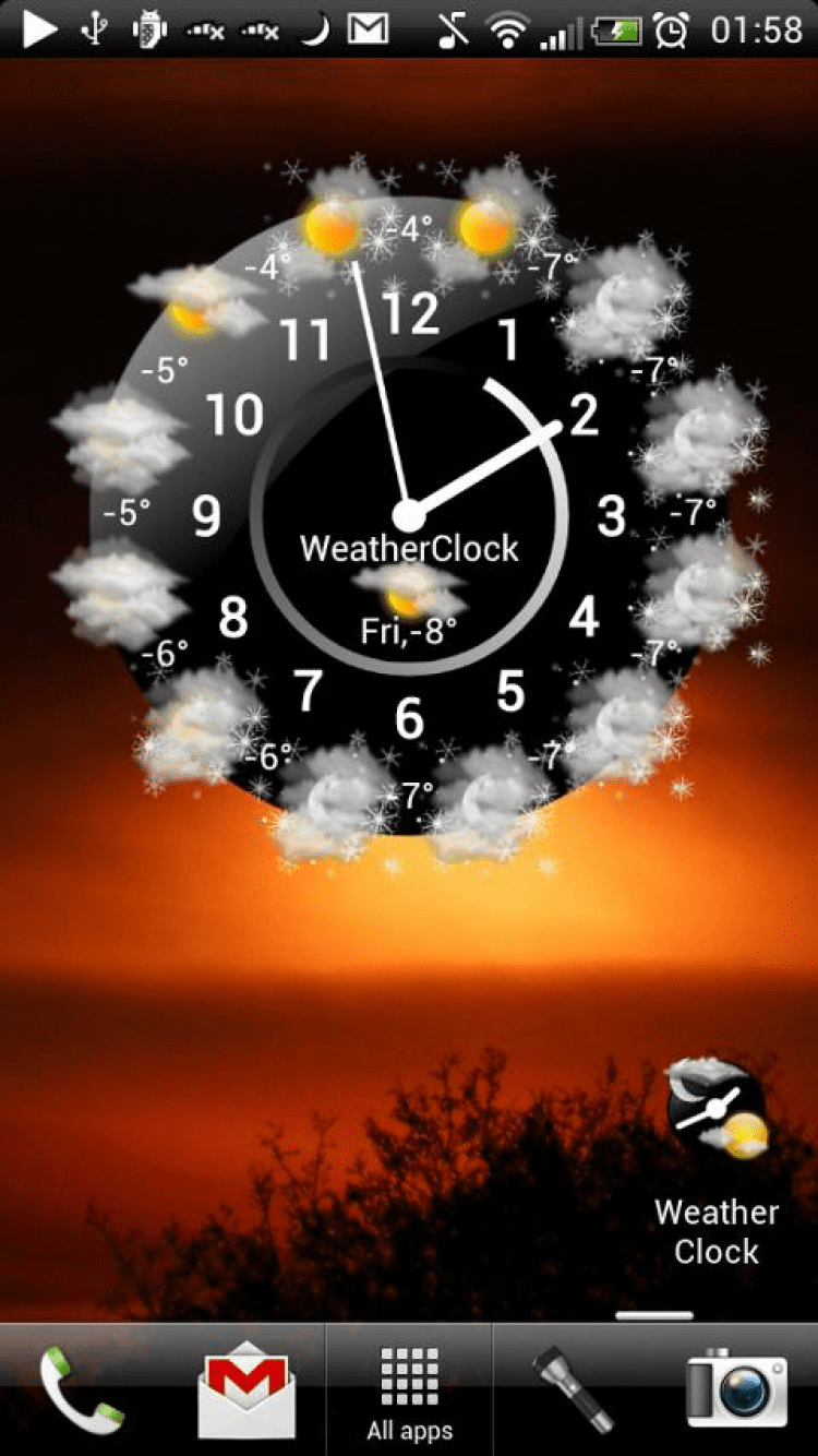 Weather Clock — это невероятное сочетание аналоговых часов и прогноза погоды для вашего мобильного устройства. Напротив цифр на циферблате будут отображаться иконки с изображением соответствующих погодных условий.