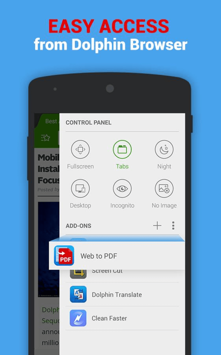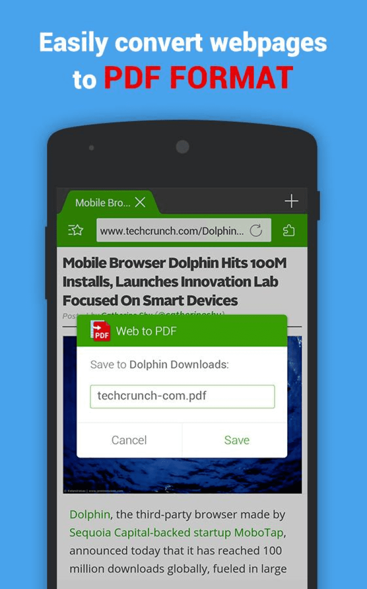 Web to PDF Аддон для самого популярного браузера на платформе Android - Dolphin Browser, который позволяет "на лету" сохранять открытые веб-страницы в PDF-документ.