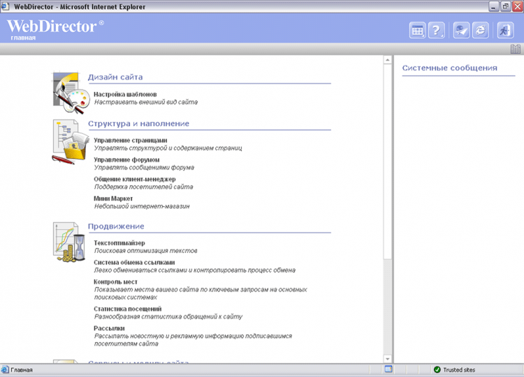 WebDirector обладает стандартной для систем управления сайтом функциональностью