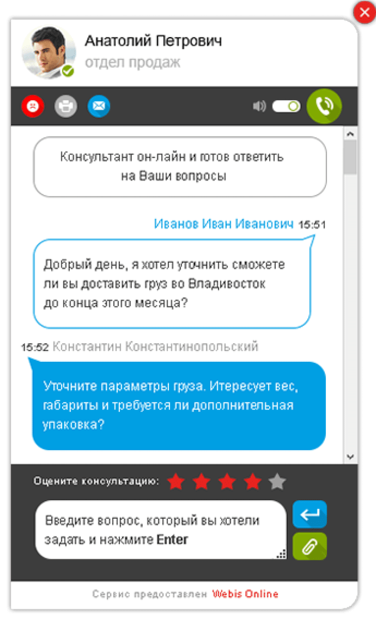 Компетентный менеджер может одновременно вести диалоги с несколькими посетителями, отвечая на их вопросы и мотивируя к покупке. Менеджер и посетитель могут даже обмениваться файлами прямо в процессе диалога. При этом ваш телефон остаётся не занятым. Говоря о телефоне: хотели бы вы получить отдельную голосовую линию для мгновенной связи с посетителями сайта? Вашим посетителям больше не нужно пользоваться обычным телефоном - для многих это фактор неудобства. Теперь достаточно одного клика – и звонок с сайта уходит вам в компанию. Такие звонки совершенно бесплатны как для посетителей сайта, так и для его владельца – оплата идёт только за пользование системой. Больше, чем коммуникации Кроме очевидных возможностей по упрощению контакта с клиентами, WebisCall – это ещё и отличный инструмент для упорядочивания, организации и оптимизации работы отдела продаж или консультаций: