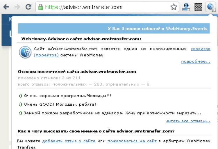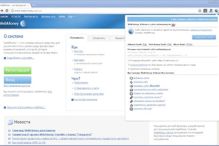 WebMoney Advisor - это расширение для веб-браузера, разработанное для пользователей платежной системы WebMoney Transfer. WebMoney Advisor встраивается в интерфейс Вашего браузера (Internet Explorer 6.0+, Mozilla Firefox 3.5+, Opera 11+, Chrome 9+) в виде специальной кнопки.