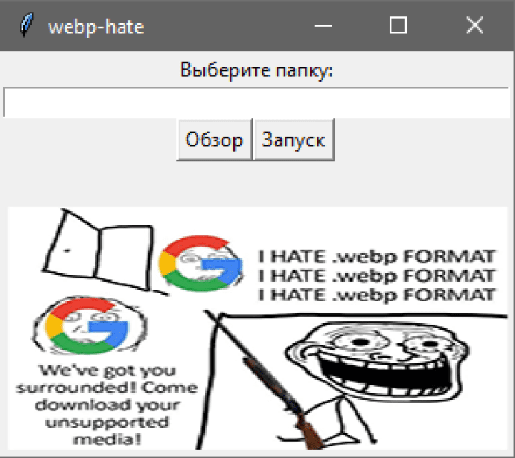Скопились webp файлы в папке? Выбери её и конвертруй одним нажатием в webp-hate.exe! Все мы знаем, что формат webp вряд ли можно назвать любимым среди разработчиков и дизайнеров. Многие видят в нем неудобства из-за его относительной неподдержки, особенно на старых устройствах, и потери качества сжатия. Это формат, который требует внимательного обращения и может вызвать головную боль в процессе обработки изображений, к тому же при скачивании картинок с Google, в 80% случаев это будет именно webp, который даже не открывается стандартным просмотрщиком изображений на Windows.