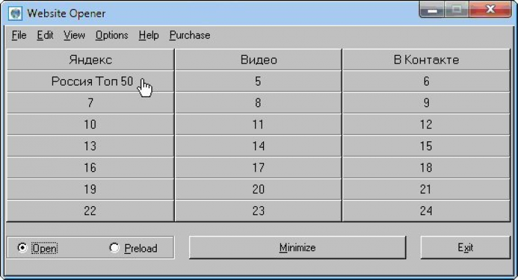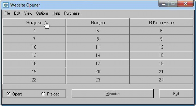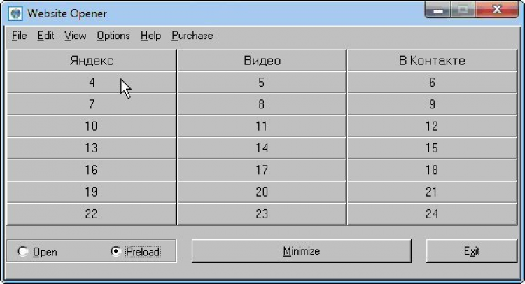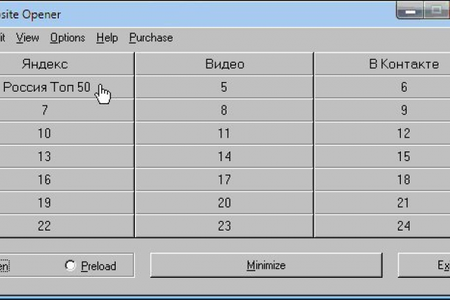 Website URL Opener — это программа, которая предлагает более удобный и быстрый способ открытия Ваших ежедневных сайтов. Программа обладает простым и понятным интерфейсом. Основное окно программы имеет 24 кнопки и 2 опции – Open (открыть сайты) и Preload (зарядить кнопки). Основное окно программы всегда располагается поверх всех остальных. Website Opener работает следующим образом. Выберите опцию Preload и нажмите любую свободную кнопку. Эти действия откроют второе окно программы, в котором Вы можете сохранить Название (Title) и интернет адресс Вашего сайта (URL). При включенном Интернете, выберите опцию Open и нажмите снаряженную кнопку – Ваш сайт будет открыт. Для наглядности работы программы Вы можете ознакомиться с изображениями ее скриншотов. Website Opener быстро и удобно открывает Ваши ежедневные сайты через веб-броузер, который установлен на Вашем компьютере по умолчанию.