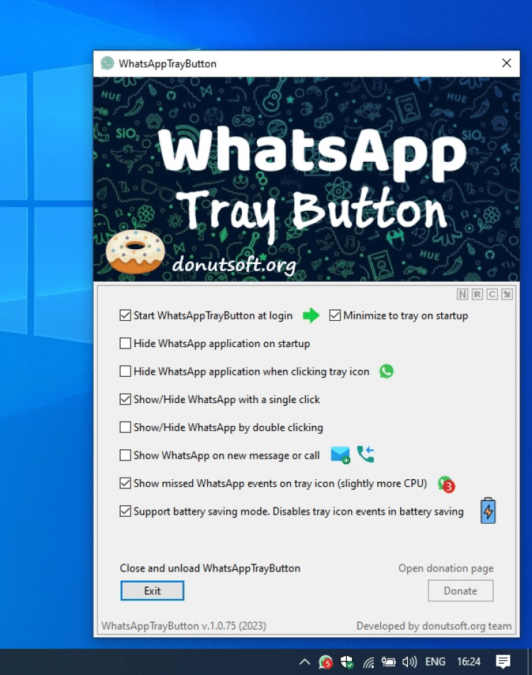 - создание и размещение значка WhatsApp в Windows Tray;