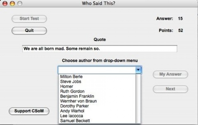 Who Said This? Программа для легкого и веселого заучивания знаменитых цитат. Программа включает в себя 124 цитаты. При запуске, вам выдается случайным образом цитата, и вам нужно выбрать верный вариант ответа, кому эта цитата принадлежит.