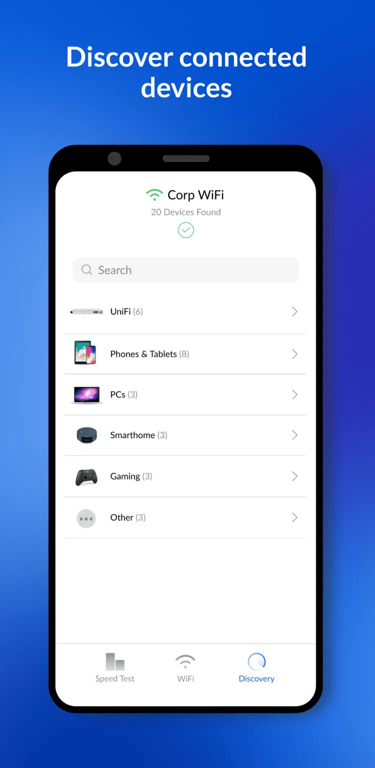 В последней версии приложения, вы можете выполнить быстрый поиск беспроводных сетей. Выберите нужную вам сеть, чтобы получить о ней детальную информацию. Помимо названия точки доступа, вы увидите уровень сигнала, увидеть все доступные устройства и сервисы, используя протоколы Bonjour, SNMP, NetBIOS и UBNT. В дополнение к этому, приложение позволяет измерить скорость доступа в Интернет. Вся информация представлена в наглядном и удобном виде.