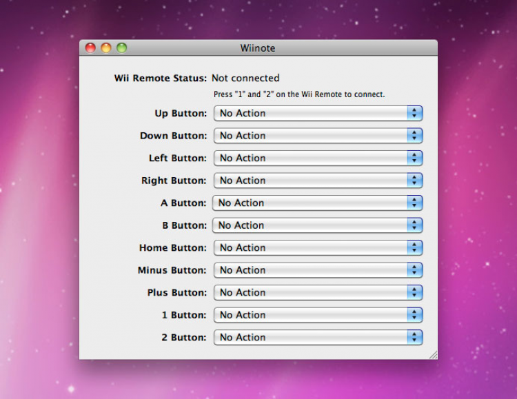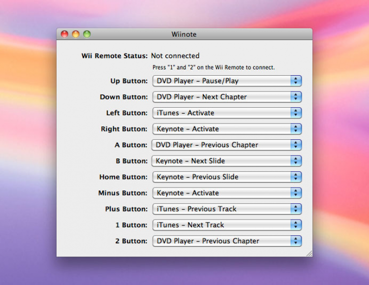 Wiinote Эта утилита позволяет управлять Keynote или любой другой программой с помощью контроллера Wii Remote. Связь с компьютером осуществляется через Bluetooth. В настройках утилиты можно назначить действия на каждую кнопку контроллера.
