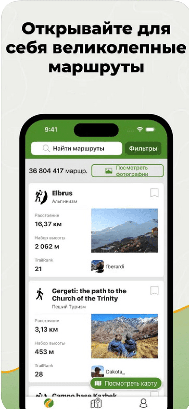 - возможность записать свои маршруты, дополнить их фотографиями и поделиться с сообществом;