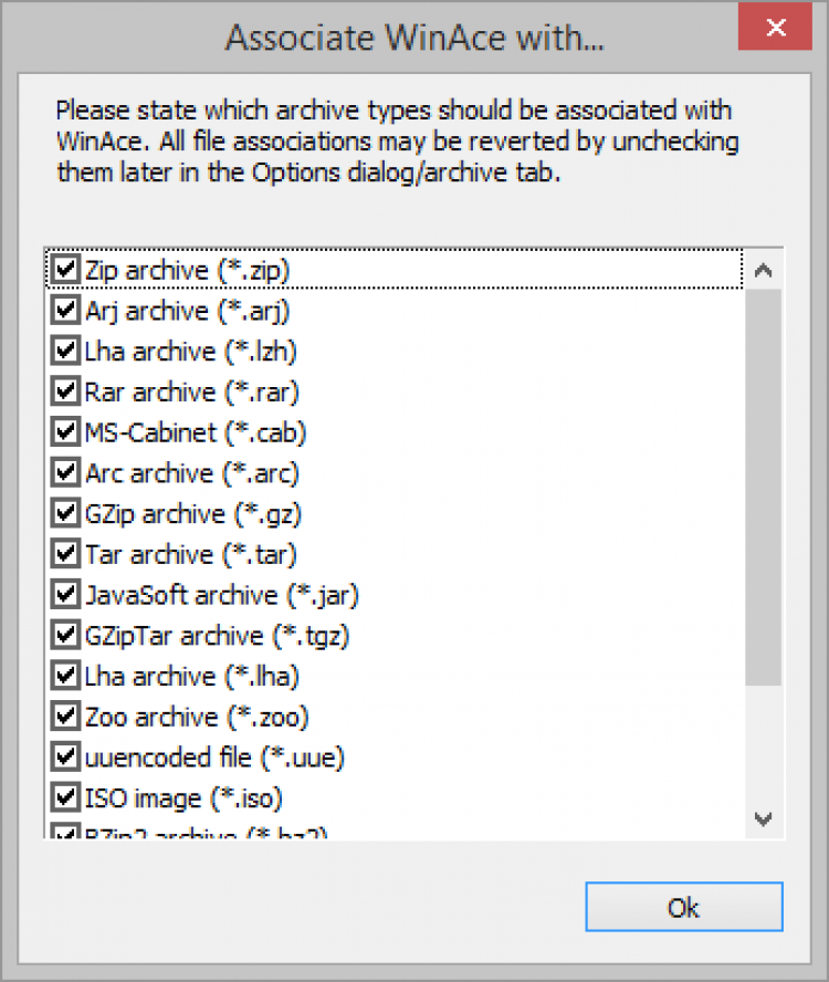 С помощью WinAce можно архивировать и извлекать файлы, создавать многотомные и самораспаковывающиеся архивы, шифровать и защищать архивы паролем. Он позволяет извлекать файлы из архивов ACE, ZIP, LHA, MS-CAB, JAVA JAR, и создавать архивы в формате ACE, ZIP, LHA, MS-CAB, RAR, ARC, ARJ, GZip, TAR, ZOO, JAR.