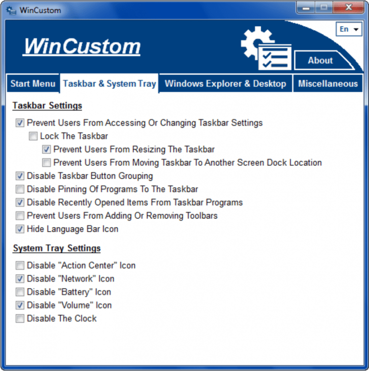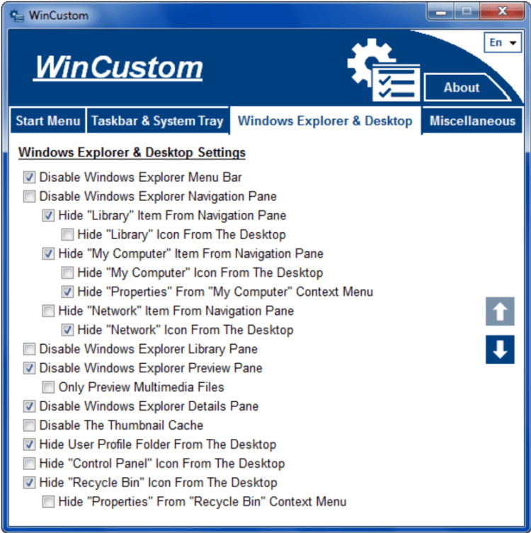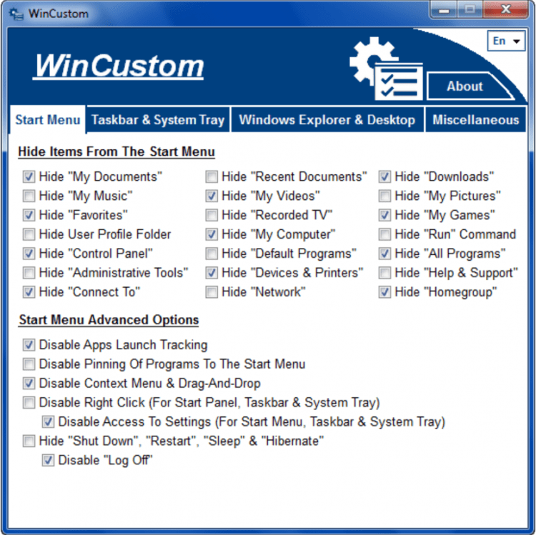 Благодаря простому интерфейсу с удобным разделением всех настроек по вкладкам, найти нужный параметр и включить/отключить его не составит никакого труда. Всего в интерфейсе 4 вкладки: Start Menu, Taskbar & System Tray, Windows Explorer & Desktop и Miscellaneous. Под каждой вкладкой скрываются десятки опций. Например, для удаления из меню ненужных кнопок и папок, отключения ненужных опций, включения нужных опций и т.д.