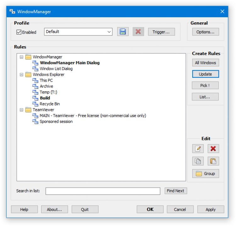 Настройки WindowManager можно сохраняются в профиль. Можно создать несколько профилей с разными настройками для разных задач. Кроме этого, программа имеет мощную систему триггеров для автоматической смены профилей, и поддерживает работу с несколькими мониторами.