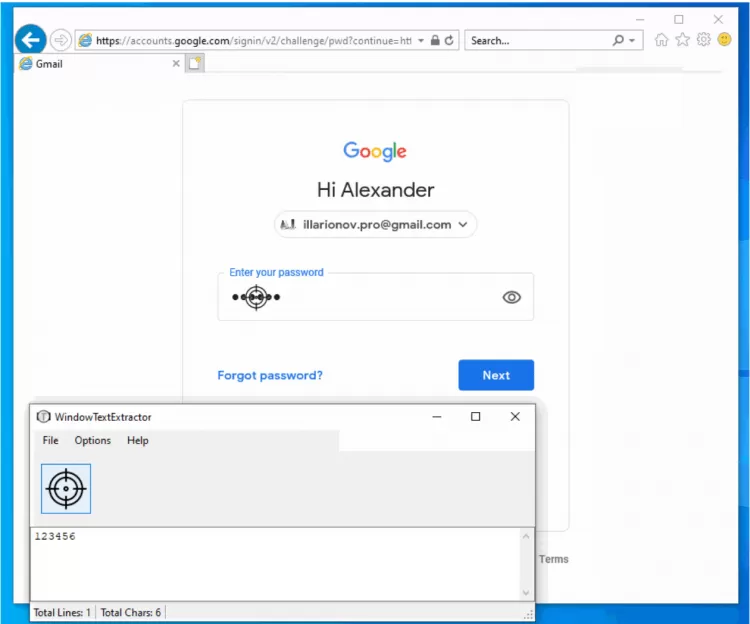 WindowTextExtractor — это бесплатная программа, которая позволяет получить любой текст из любого окна операционной системы, будь то Проводник, другое приложение, диалоговое окно, консоль и пр. В добавок к этому она способна раскрыть пароль, скрытый за звёздочками (*).