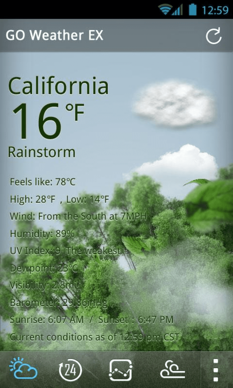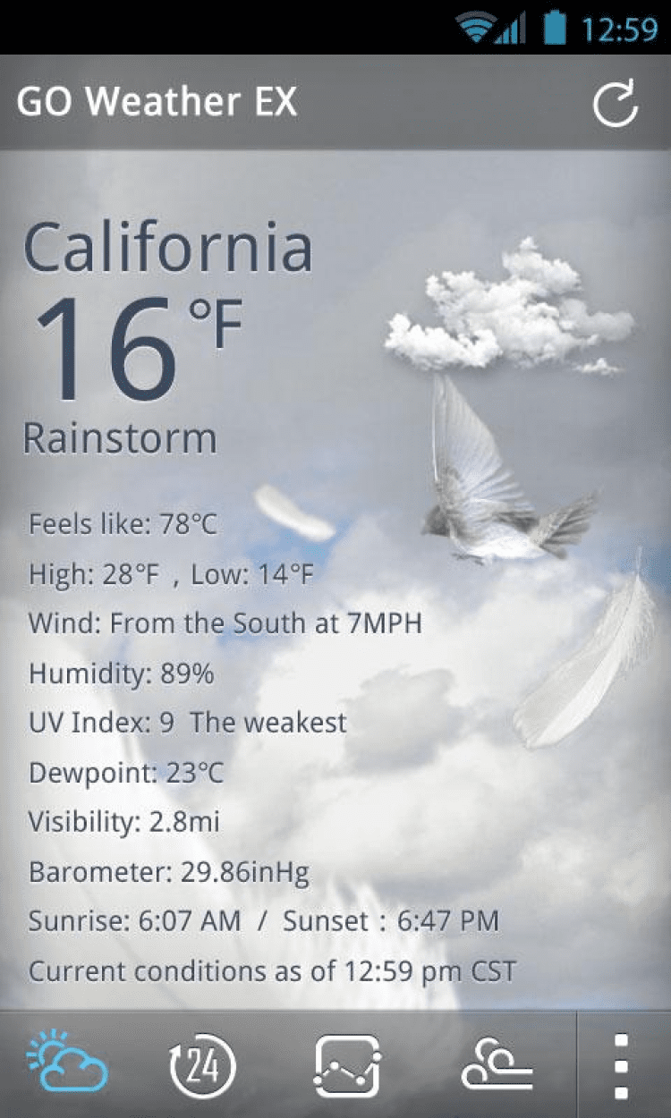Windy Day Weather Widget Theme — красивая тема оформления в стиле ветреного дня для приложения GO Weather EX. Для её использования, необходимо сначала установить GO Weather EX. Поддерживаются виджеты размеров 4*1, 4*2, 2*1.