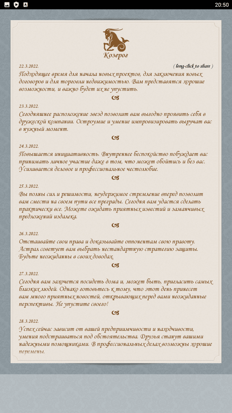 - можешь поделиться своим гороскопом в соц. сети, либо отправить по почте: для этого нажать на гороскоп и подождать несколько секунд.