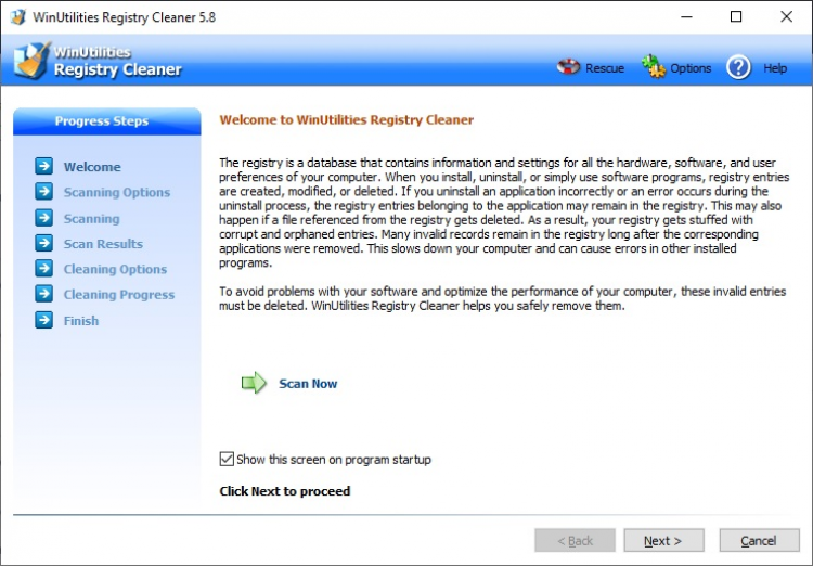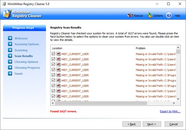 ВинУтилитес Фри Регистри Клинер очень проста в использовании. Для безопасной очистки системы, она не потребует от вас практически никаких действий или наличия каких-либо познаний в ПК. Просто откройте программу и следуйте понятным инструкциям. В большинстве случаев, они будут сводиться к нажатию на кнопку "Next". При желании, вы можете выбрать, где необходимо искать ошибки, а затем ознакомиться с описанием каждой из них или экспортировать список в формате HTML.