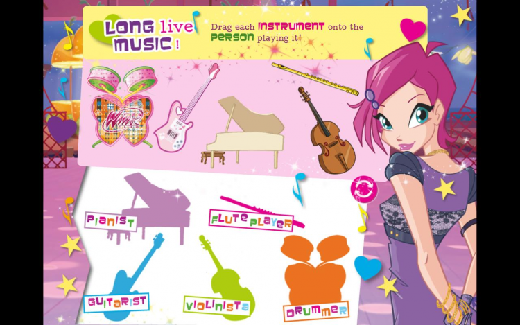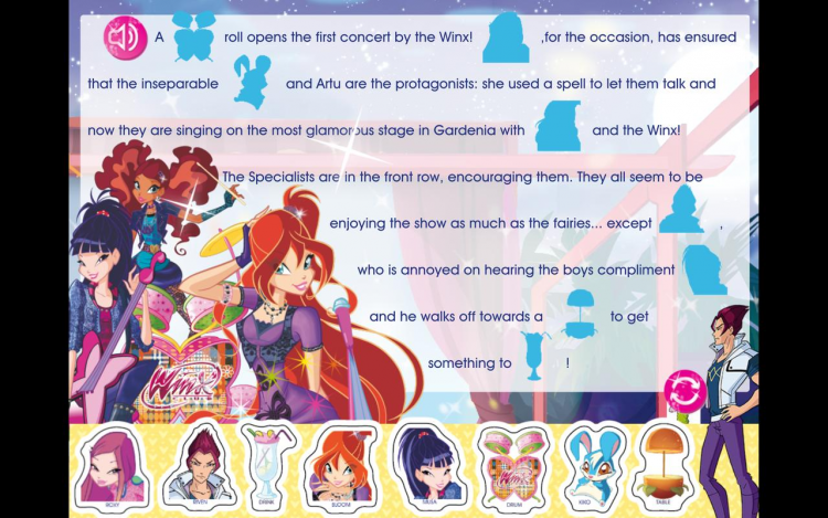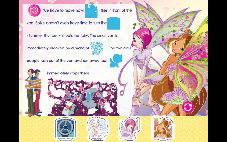 В этой программе вы найдете различные истории о феях Винкс, повествующие о настоящей дружбе. Погрузитесь в увлекательные приключения вместе с персонажами любимого мультсериала, при помощи своего мобильного устройства. Правда, чтобы прочитать ту или иную историю, вам необходимо дополнить его, заполнив пропуски подходящими стикерами. Все истории имеют прикольное звуковое сопровождение и обладают приятной анимацией.