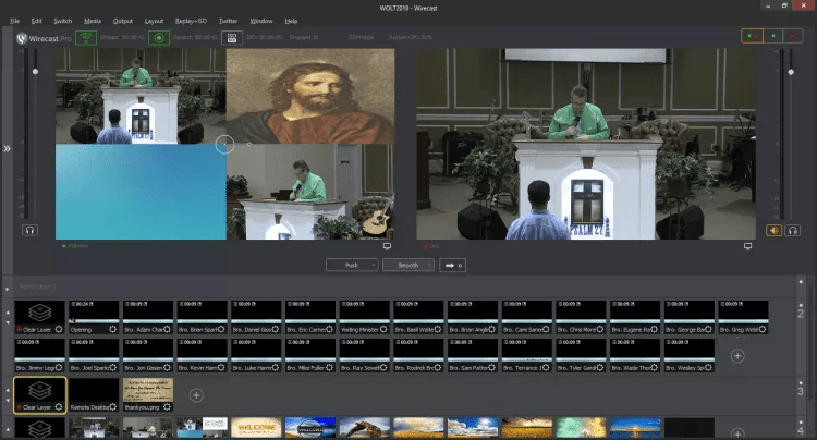 В трансляцию можно добавлять изображения, аудио и видео материалы. В Wirecast есть инструменты для предварительной подготовки материалов к стриму. Контент можно выводить в любую часть экрана, изменять размер и прозрачность. Программа поддерживает разную частоту кадром, минимум 25 к/с, максимум - 60 к\с.