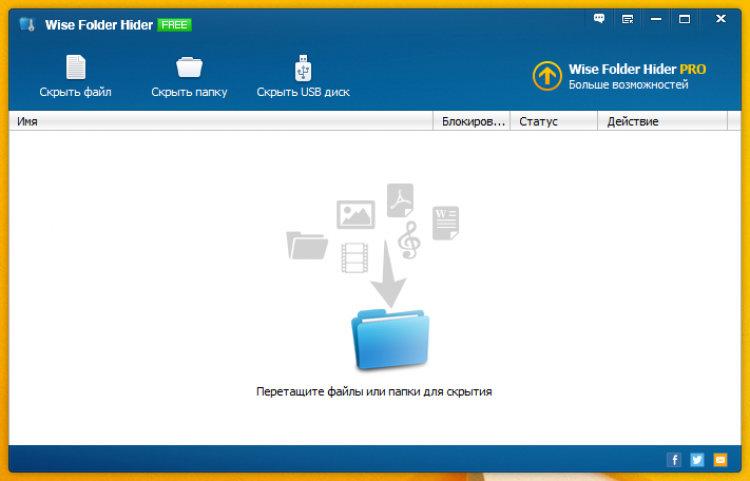 Wise Folder Hider позволяет прятать любые файлы, включая документы, фотографии, видео и другие типы. Программа очень проста в использовании. Для того, чтобы добавить папку или файлы, просто перетащите их в окно программы и установите пароль.