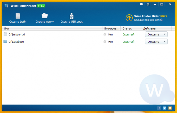 Wise Folder Hider Free - бесплатная программа, которая поможет вам спрятать важные файлы, папки, а также информацию на подключенном к компьютеру USB-накопителе от посторонних глаз. Она может стать отличным решением для тех пользователей, кто ищет просто и удобный способ спрятать личные данные на компьютере.