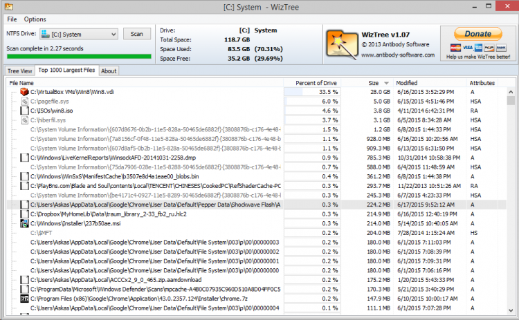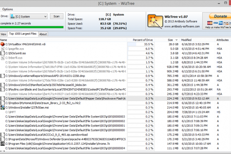 Кроме этого, WizTree Portable показывает на отдельной вкладке 100 самых "больших" файлов. Таким образом, с ее помощью можно быстро выяснить, что занимает больше всего места на жестком диске.