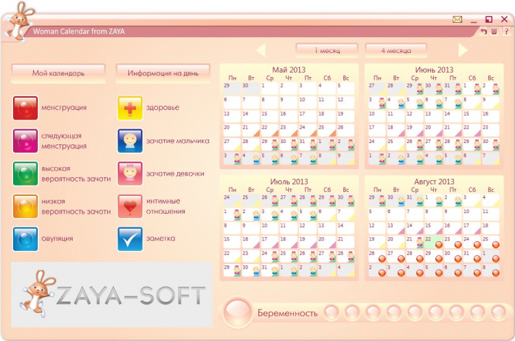Woman Calendar from ZAYA - это бесплатный женский календарь. Он позволяет отслеживать циклы менструаций, планировать беременность, отслеживать ход беременности, вносить информацию о новорожденных детях, вносить различные заметки на каждый день, вести свой собственный календарь.