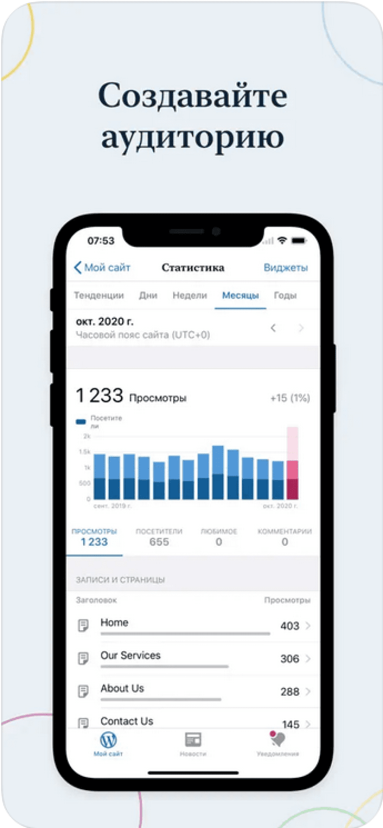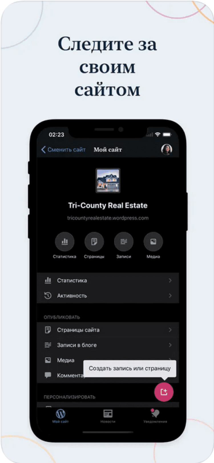 Скачайте приложение WordPress на свой iPhone или iPad и управляйте своим сайтом или блогом прямо с экрана своего мобильного устройства, в любой момент.