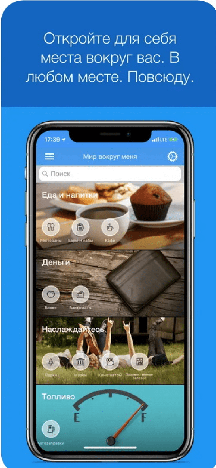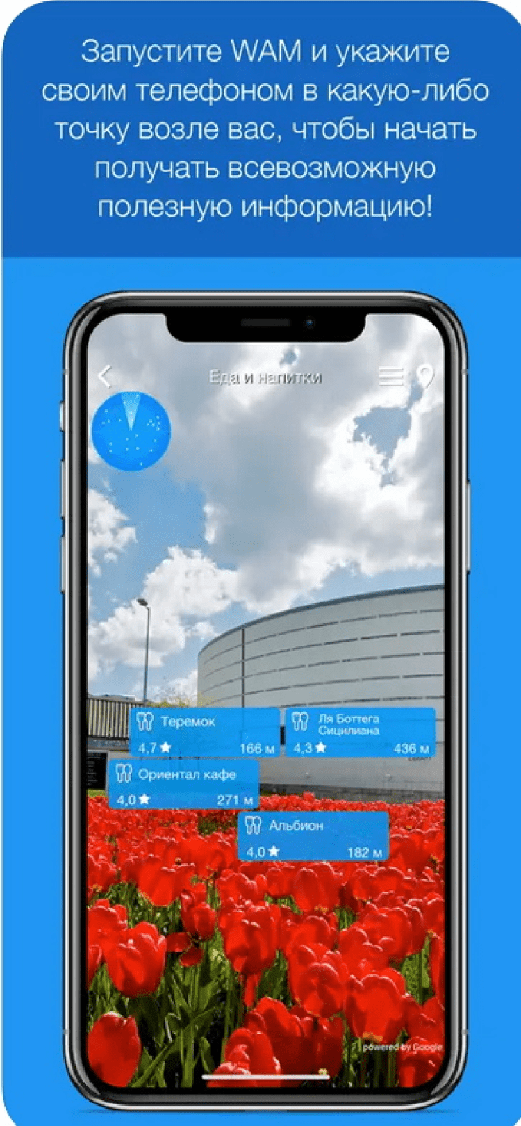 World Around Me (WAM) Lite Эта программа поможет вам узнать обо всех интересных объектах вокруг вас. Просто направьте свое мобильное устройство в нужном вам направлении, а программа отобразит местоположение различных объектов, таких как остановки транспорта, рестораны, кафе, бары, кинотеатры, банки, банкоматы, музеи, парки, автозаправки, больницы, аптеки, тренажерные залы, спа-салоны, отели, торговые центры, продуктовые магазины, церкви, а так же многое другое.