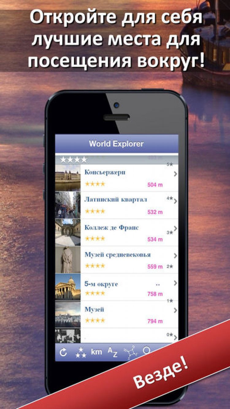 В любой точке земного шара, где бы вы ни находились, «WORLD EXPLORER» предложит список достопримечательностей, расположенных поблизости (памятники, музеи, населенные пункты и т.д.), и даст оценку их туристического интереса. Приложение поможет быстро определить местные объекты, достойные внимания. Выберите один из них и посмотрите сведения о нём онлайн: историю, любопытные факты, статистические данные, фотографии и т.д. Теперь вы ничего не упустите и не пропустите!