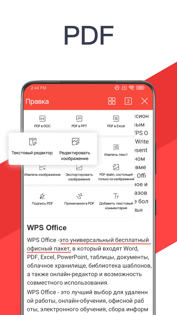 В состав программы WPS Office входит удобный инструмент для работы с PDF-файлами. Вы сможете просматривать документы в данном формате, а также вносить в них изменения. Также, при необходимости, в формат PDF можно конвертировать документы (Word, Text, Excel, Powerpoint и Doc. Кроме того, программа позволяет с легкостью создавать презентации и управлять ими через WIFI, NFC или DLNA. А поддержка Miracast позволяет с удобством работать с совместимыми беспроводными дисплеями.