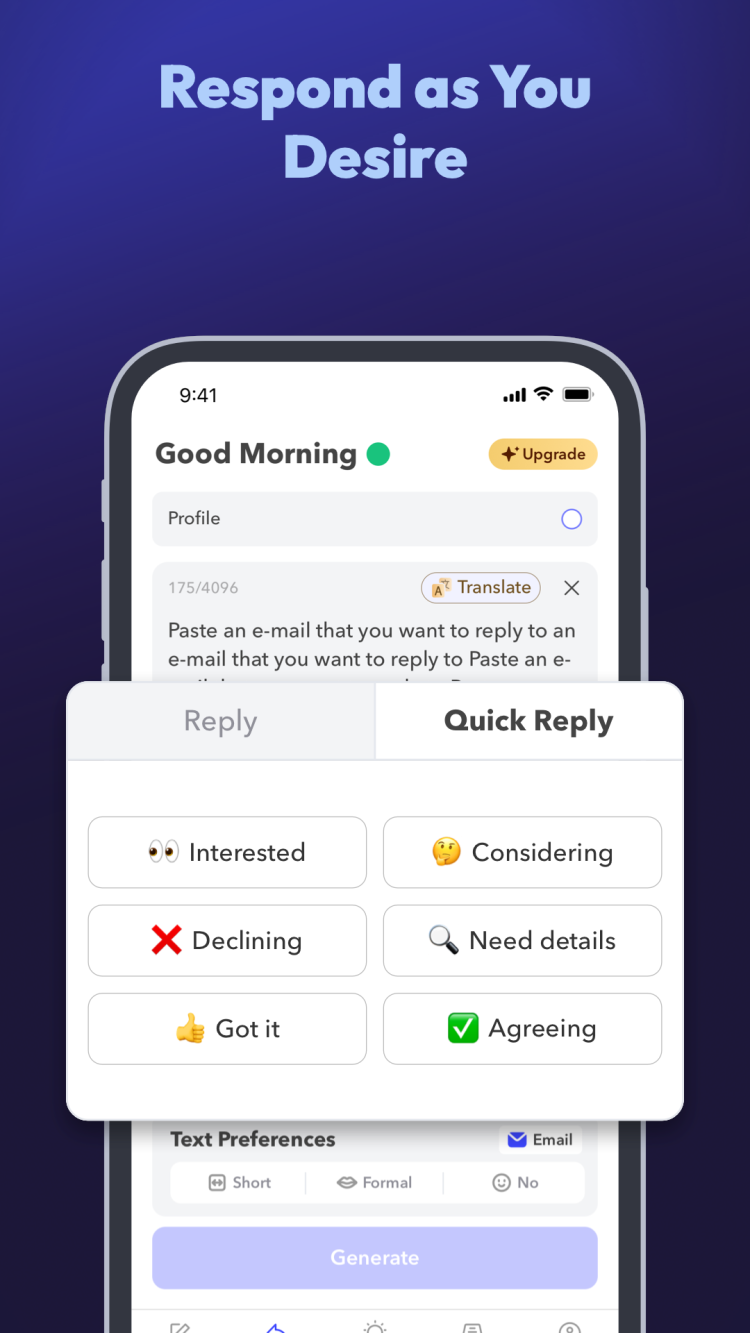 Ещё одна интересная особенность программы Xemail для Android — функция генерации ответных сообщений. Просто скопируйте текст входящего письма или сообщения в программу, а ИИ сделает всё остальное.