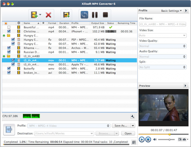 Xilisoft MP4 Converter Удобный конвертер большинства популярных форматов в MP4. Переводит форматы AVI, MPEG, VOB, 3GP, MOV, MP4, M4V, и тп. в MP4, поддерживаемый такими устройствами как iPhone, iPod, Apple TV, PSP, PS3 и в AVI для таких устройств, как Archos, Creative Zen и iRiver PMP. Так же может извлекать MP3, AAC и M4A из большинства форматов видео.