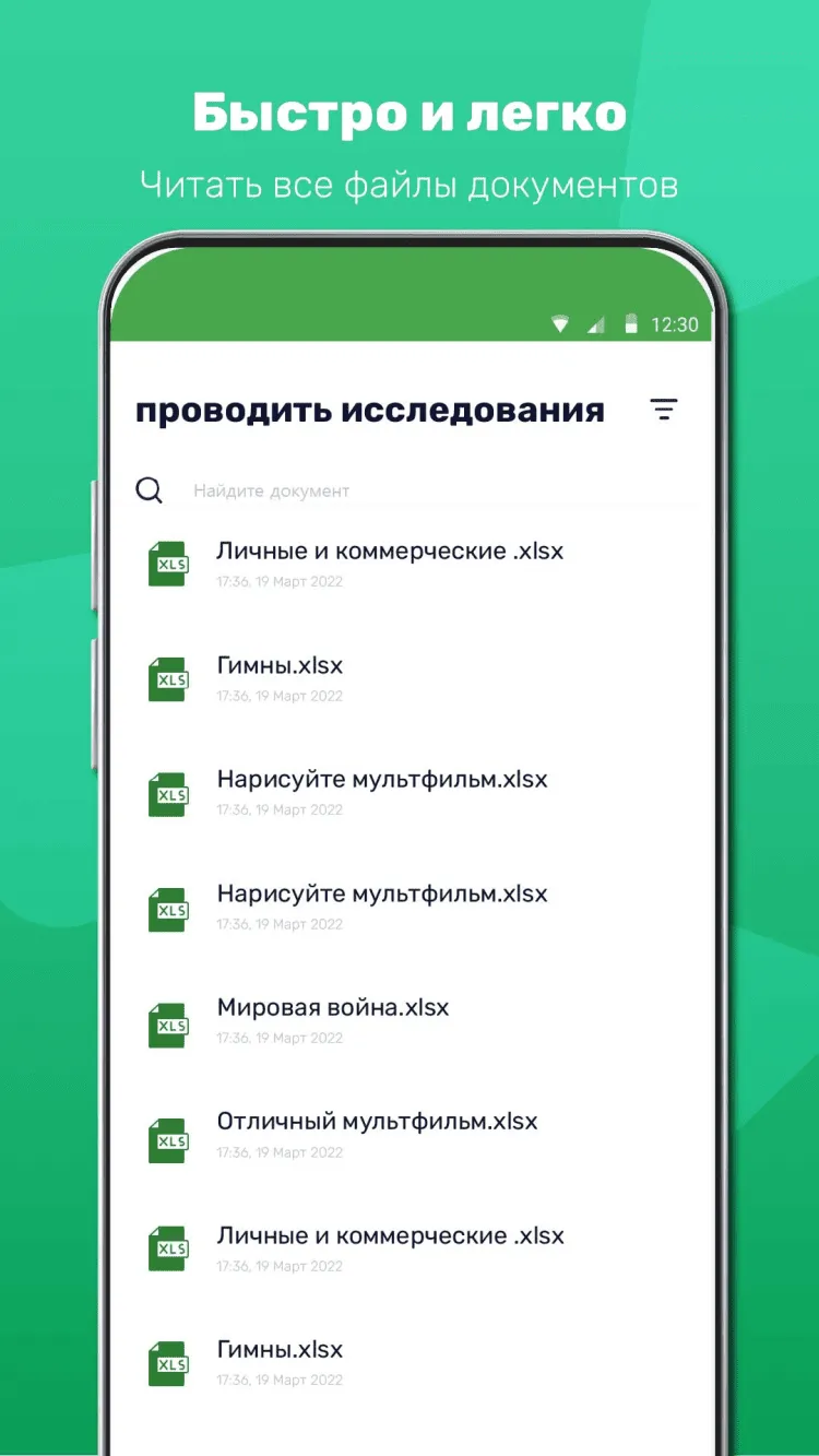 Срочно нужно проверить данные в таблице Excel, а компьютера под рукой не оказалось? Тогда вам поможет это приложение. Оно предназначено для просмотра документов в форматах XLS и XLSX в офлайн-режиме. Программа прекрасно подойдет тем, кто хранит огромное количество документов на своем смартфоне: XLSX Reader автоматически просканирует память гаджета и предоставит готовый список всех совместимых документов. Вам не придется искать файлы, раскиданные по внутреннему хранилищу, вручную. Для большего удобства, можно отсортировать список файлов по дате создания, времени последнего использования или имени. А приятным дополнением станет функция поиска по названию документа.