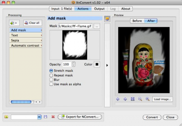 XnConvert поддерживает все распространенные графические форматы, и позволяет с легкостью конвертировать изображения между ними. Выходные изображения можно сохранять в локальную папку, архив, FTP-сервер, а также отправлять по электронной почте и загружать их в Flickr или Picasa. XnConvert позволяет не только конвертировать изображения. Программу можно также использовать для удаления мета-данных, изменения цветового баланса, обрезки и наложения визуальных эффектов.