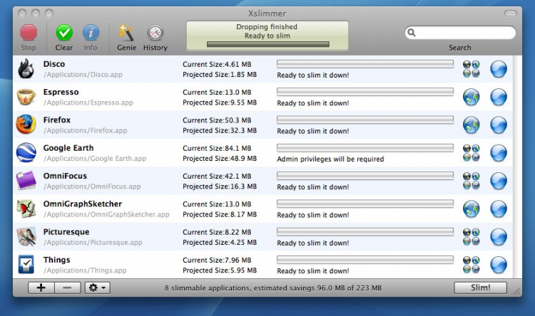 Xslimmer Увеличивает свободное место на жестком диске, уменьшая размер установленных приложений. Xslimmer составит список всех приложений, размер которых можно уменьшить. В то же время, она не даст "ужать" приложения, чья работоспособность может пострадать от этого, а это, как правило, различные системные утилиты.