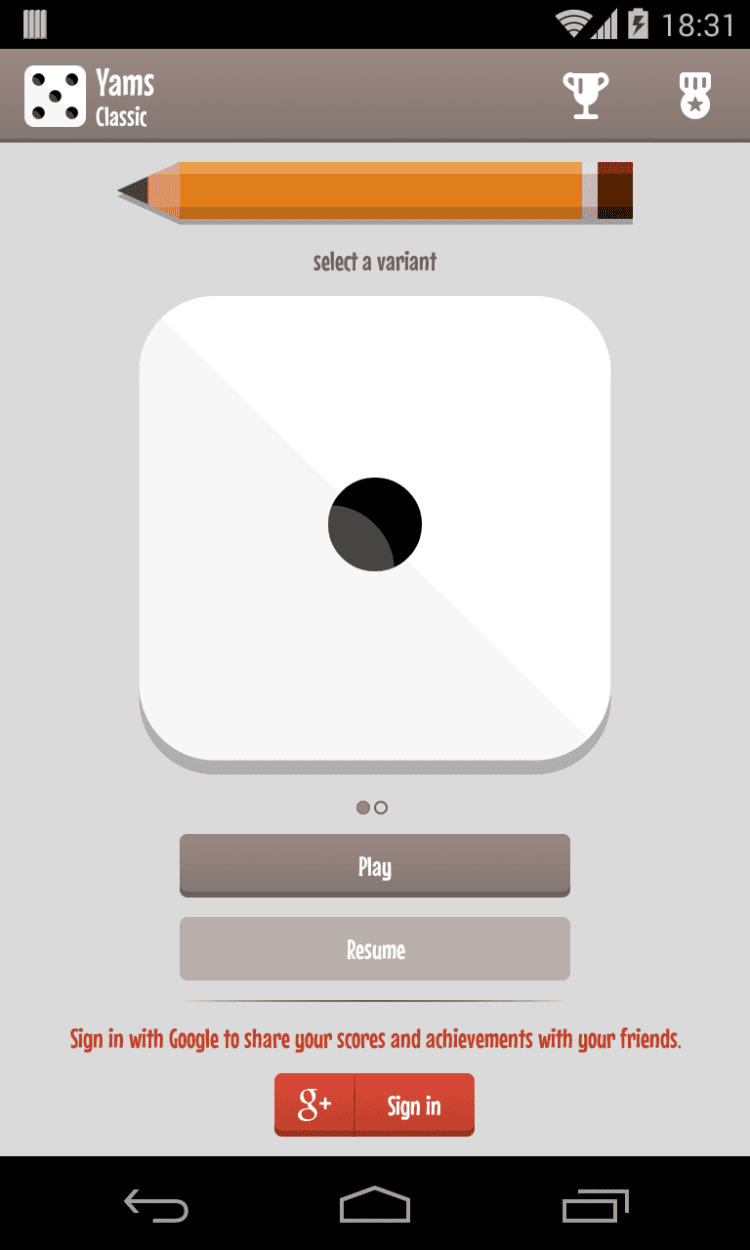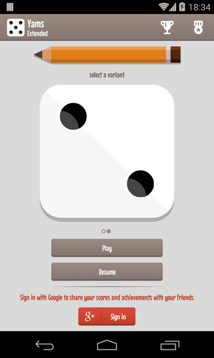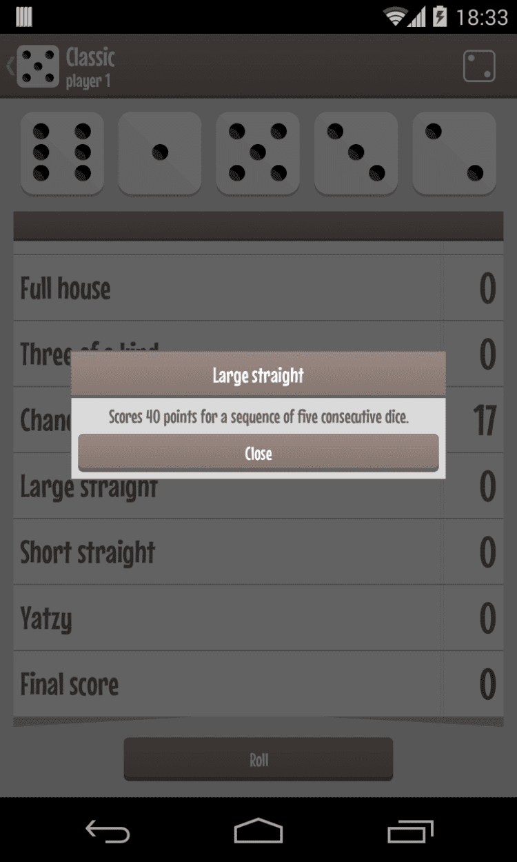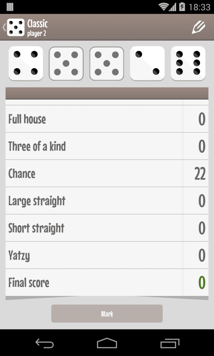 Yatzy (dice game) — это очередная версия популярной игры на кубиках для мобильных устройств на Android. В эту игру играют при помощи 5 кубиков. Целью игры является набрать как можно больше очков, выбрасывая определенные комбинации.