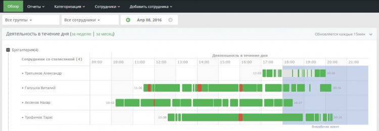 - интуитивно настраиваемая категоризация (сотрудников по отделам и приложений/сайтов по продуктивности);
