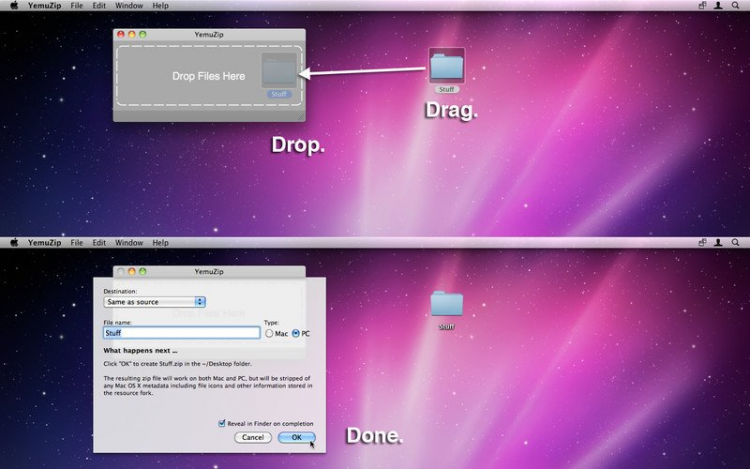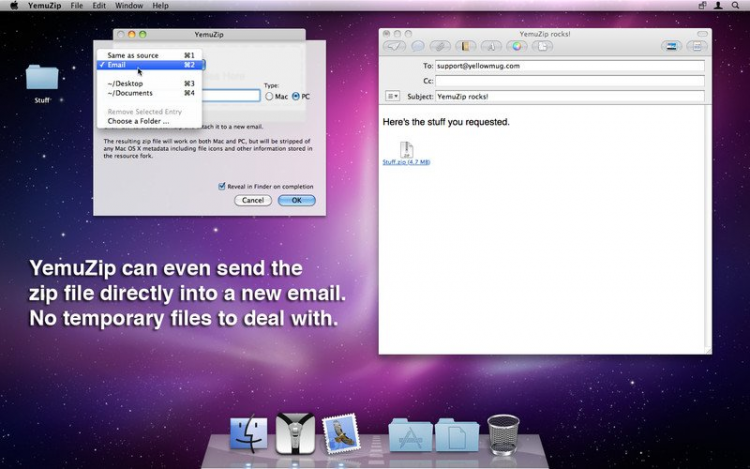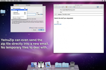 В отличие от большинства других архиваторов для Mac OS, YemuZip позволяет пользователю создавать архивы для Маков, или же специально для компьютеров работающих под ОС Windows. Последние не содержат дополнительных файлов и папок, нужных только для Mac OS.