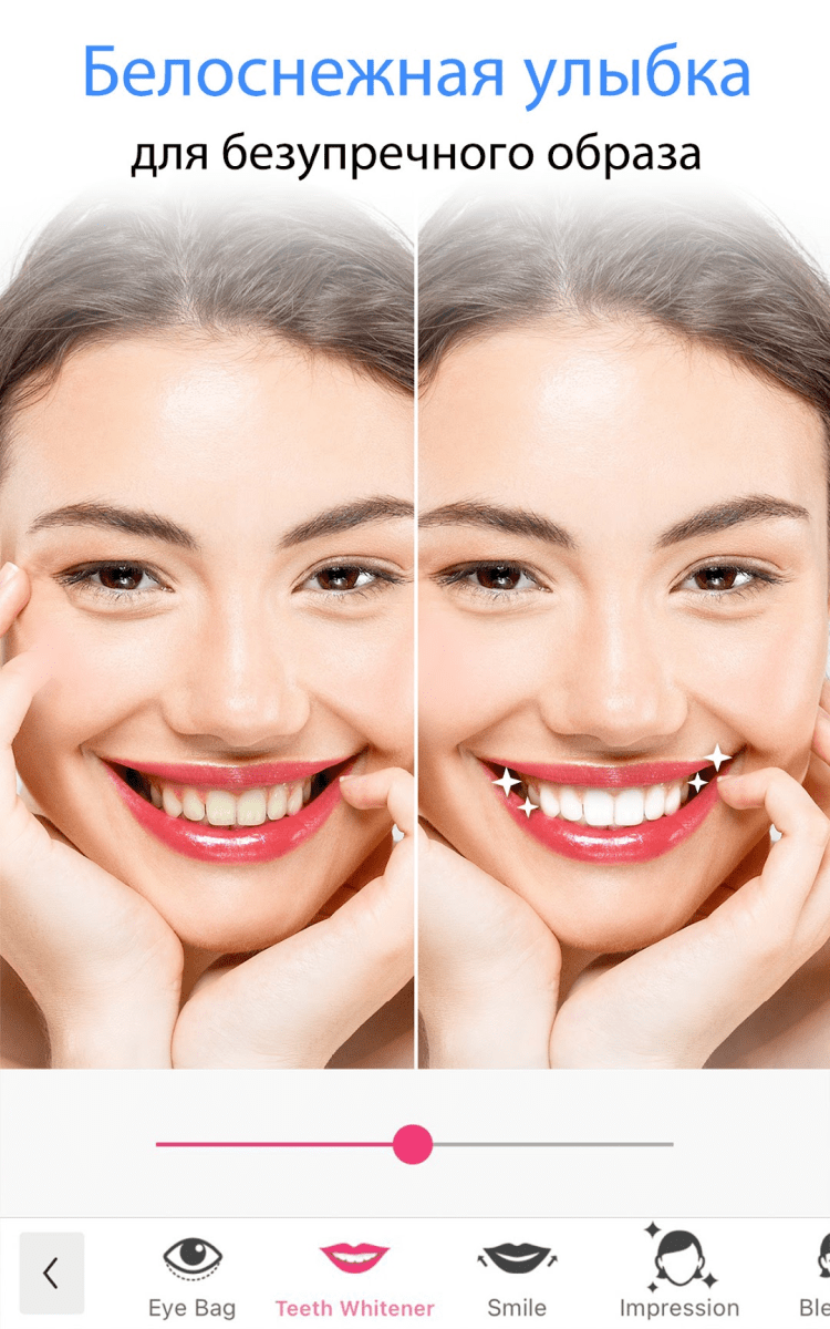 Программа также включает в себя инструмент для отбеливания зубов. Сделайте свою улыбку ослепительной и закрепите результат, нанеся яркую губную помаду.
