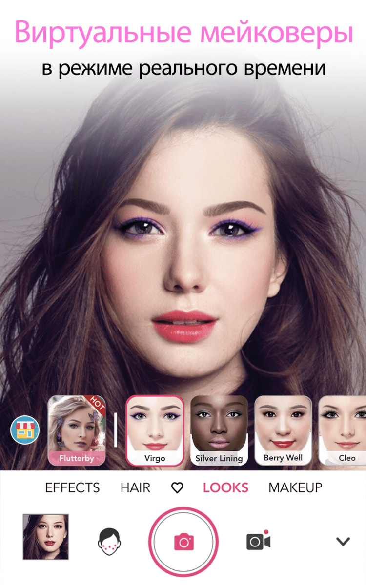 Приятной особенностью YouCam Makeup является наличие умного детектора, распознающего контура лица. С его помощью, вы сможете наложить виртуальный макияж на свое лицо, активировав камеру своего мобильного устройства. Это позволит вам со стороны взглянуть на тот или иной созданный вами образ, а также найти наиболее подходящий для вас цвет.