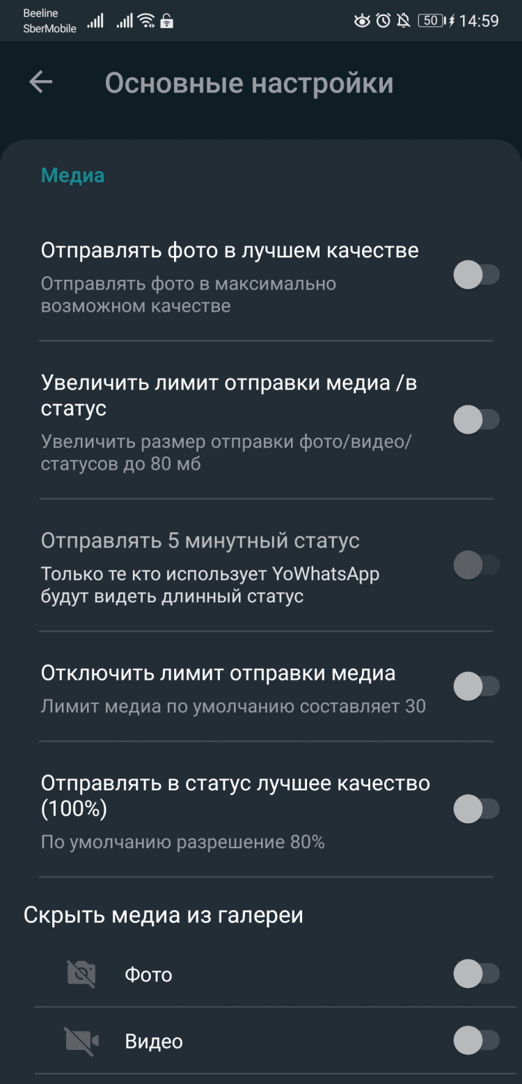 Приятный сюрприз ожидает тех, кто использует WhatsApp для быстрого обмена фотографиями и видеороликами. YoWhatsApp (он же YoWA) позволяет отправлять фотографии в разрешении до 100 МП, без потери качества. Что касается видео, то их максимальный размер составляет 80 Мб. В один чат можно отправить до 1000 медиа файлов за раз, чего наверняка будет достаточно даже для хардкорных любителей мобильной фотографии. А приятным дополнением станет возможность публиковать видео статусы продолжительностью. до 5 минут.