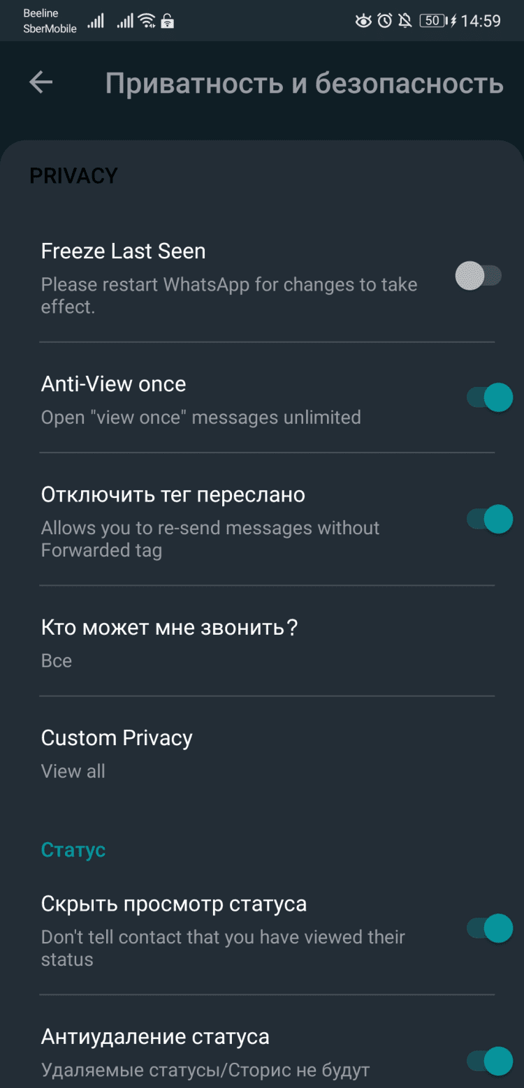 На первый взгляд, это приложение мало чем отличается от официальной версии мессенджера. При первом входе, пользователю предлагается авторизоваться при помощи номера телефона и загрузить резервную копию данных из WhatsApp. Незнакомым нельзя назвать и интерфейс программы, что ещё раз напоминает, что перед вами мод, а не самостоятельный мессенджер, созданный с нуля. Но по мере использования, отличия от привычного WhatsApp становятся всё более очевидны. Так, вы можете запретить удаление сообщений и анонимно просматривать статусы других пользователей, а также вносить уникальные настройки приватности для каждого контакта по отдельности.