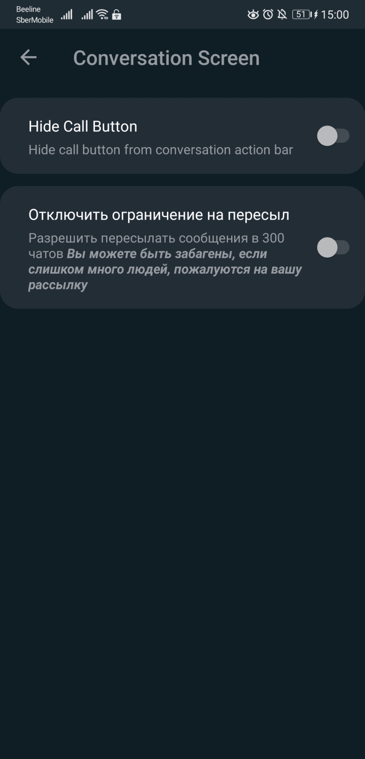 - можно отключить ограничение на пересылку сообщений в более, чем 300 чатов.