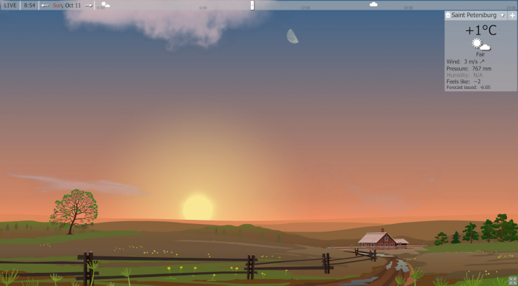 Предоставляет пользователю информацию о температуре воздуха, направлении и скорости ветра, облачности, осадках, уровне атмосферного давления, продолжительности дня со временем восхода и заката, фазе луны, дальности видимости и многом другое. Изменения погоды или времени года отражаются на живом изображении.