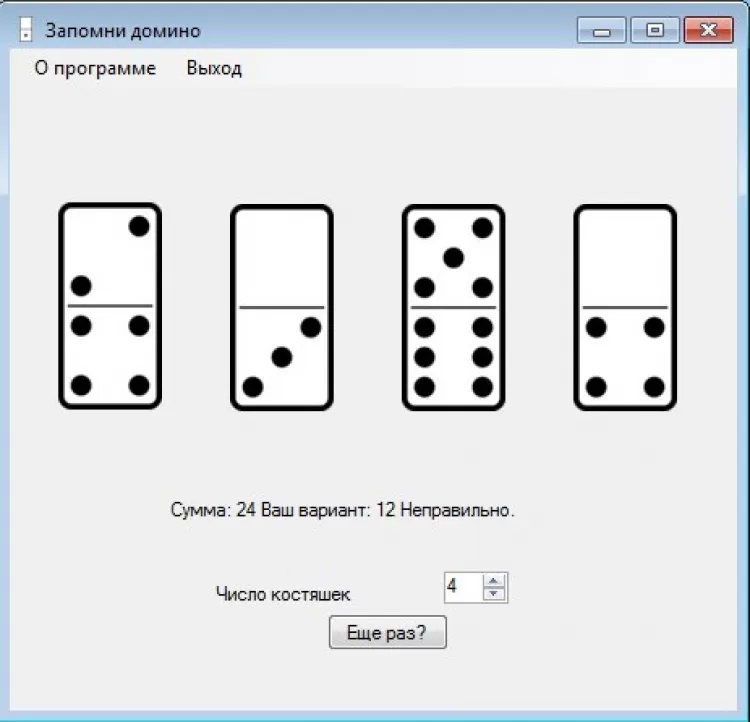 Программа «Запомни домино» дает возможность потренировать ваше внимание с помощью простого, но эффективного упражнения. На экране вам показывается в течение трех секунд выбранное число костяшек домино. После этого они убираются, а вы должны ввести сумму точек на всех этих костяшках. Просто? Да, для одной костяшки. А для трех или четырех? Попробуйте – упражнение будет полезно как взрослым, так и детям.