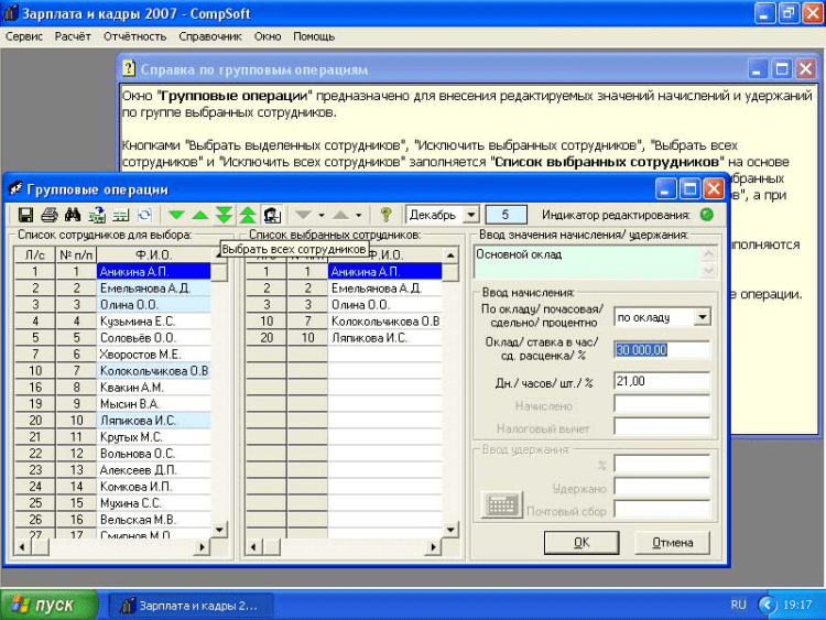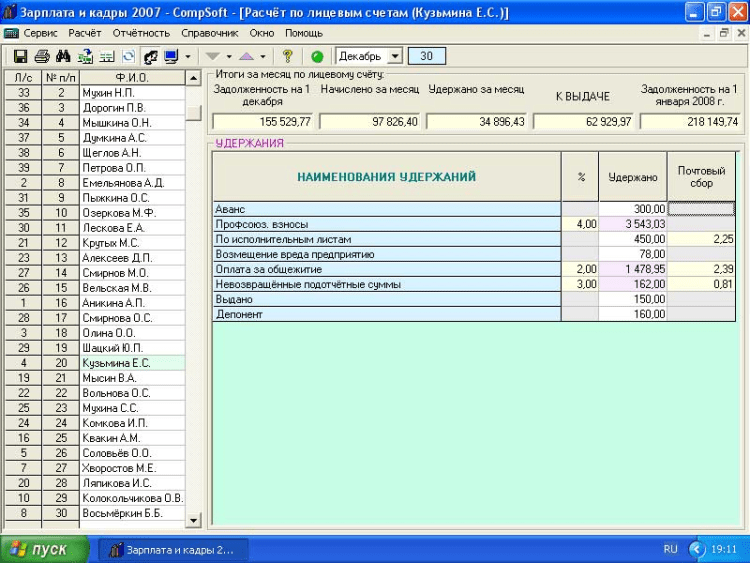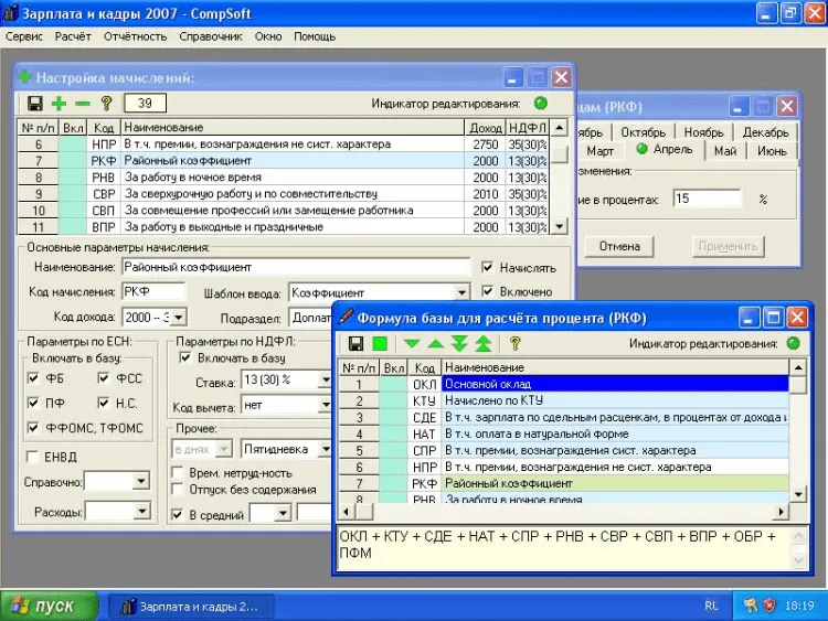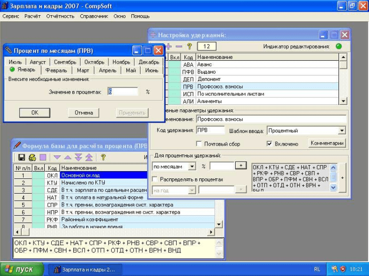 В программе Зарплата и кадры 2008 - CompSoft реализована удобная, наглядная и практичная возможность настройки и добавления начислений и удержаний по любому алгоритму (в том числе с автоматизацией начислений по среднему заработку отпускных, больничных и т.п.) с возможностью их настройки. Модули для настройки выполнены с учётом максимального комфорта для Пользователя, что подтверждает практика реального использования. При настройке начислений можно включать налоговые вычеты.