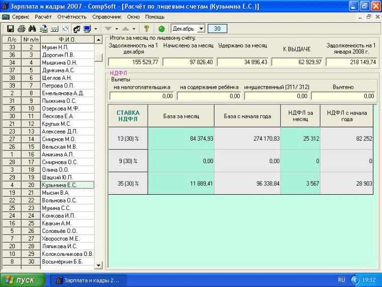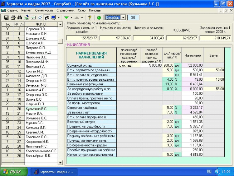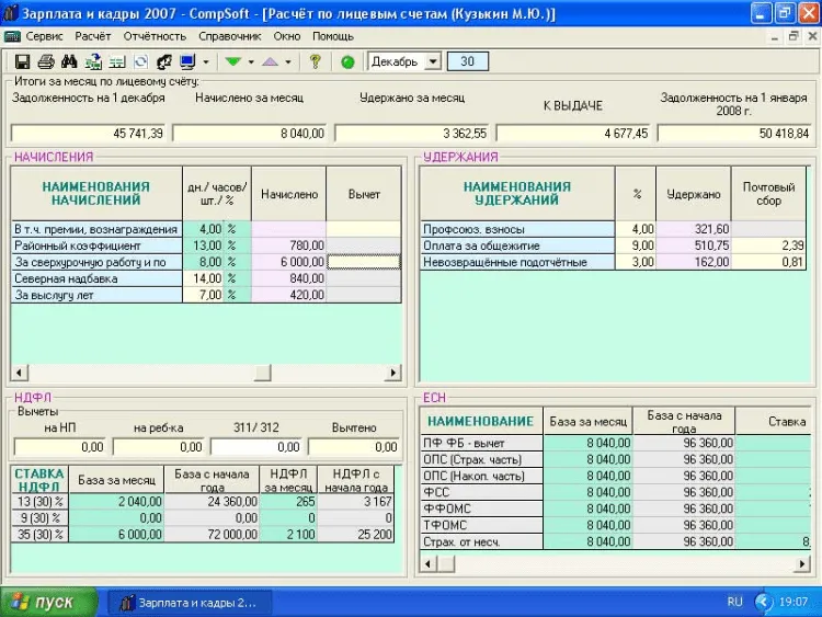 Программа Зарплата и кадры 2008 - CompSoft полностью соответствует действующему законодательству. Включён импорт сведений об Организации, кадровых данных и адресов, настроек начислений и удержаний из Зарплата и кадры 2007 - CompSoft с гибкой настройкой. Подробный учёт кадровых сведений. Вывод в MS Excel и в электронные файлы бухгалтерской отчётности, индивидуальных и сводных карточек ЕСН и ОПС, персонифицированный учёт, 1-НДФЛ, 2-НДФЛ с выводом в файл XML. Модуль Учёт рабочего времени с пересылкой данных табеля в данные начислений заработной платы. При приобретении ПО, Пользователь ставится на бесплатное абонентское обслуживание. Это означает, что в течение календарного года бесплатно предоставляются новые версии Зарплата и кадры 2008 - CompSoft, а так же бесплатная on-line поддержка по вопросам работы приобретённой программы.