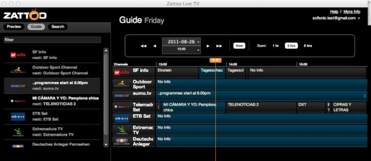 Zattoo Позволит вам просматривать телеканалы на вашем компьютере. Доступны в основном местные каналы, но есть и несколько международных каналов, таких как Bloomberg и Press TV. Так же в приложении есть программа ТВ-передач, которая позволит вам планировать просмотр.